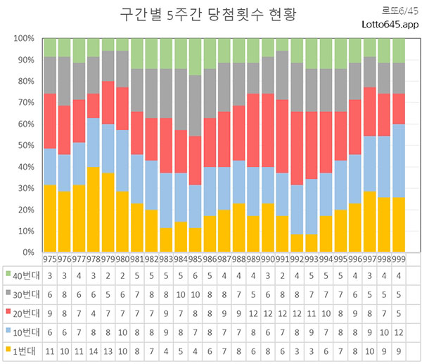 로또번호 선택할 때 로또복권 구간별 5주간 당첨횟수 현황도 살펴 봅니다.