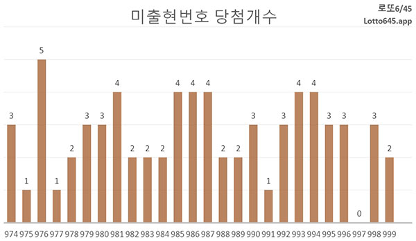 999회차 2개 로또번호가 5주 미출현 번호에서 일치 되었고, 최근 평균 3개 번호는 미출현에 포함된 숫자들입니다.