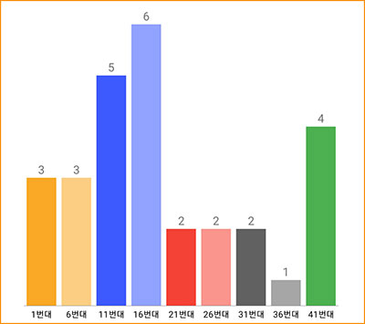 10번대로 구분한 당첨 현황인데, 11 ~ 20(10번대) 파랑색은 증가 추세이고, 40번대 녹색은 큰 변화는 없지만 높은 당첨 실적을 유지하고 있네요.