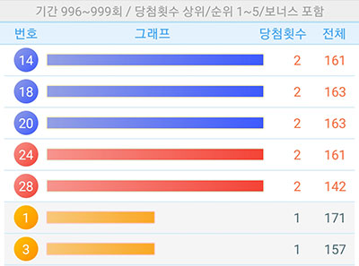 2022년 1월 1일 996회 부터 1월 22일 999회까지 합산하여 가장 많이 당첨된 번호는 14, 18, 20, 24, 28번으로 확인 됩니다.