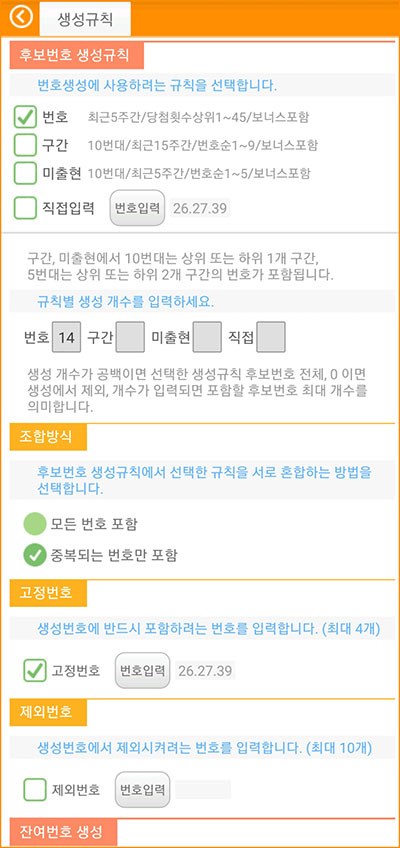 후보번호 생성규칙으로 번호, 구간, 미출현, 직접입력 방식을 제공하여 로또예상번호 조합 생성할 때 기준 자료 됩니다.