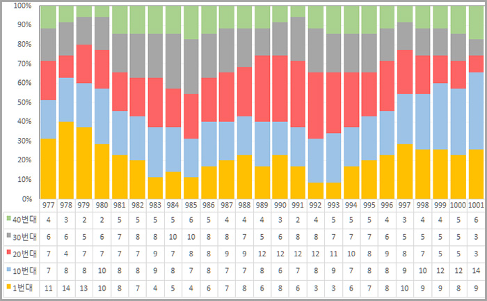 로또복권 5주 당첨번호 통계 흐름에서 1001회차까지는 20번대 빨강색이 하락하고 10번 파랑색이 증가하고 있습니다.