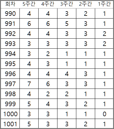 로또 당첨번호가 가장 많은 기간은 5주간 입니다. 그래서 로또1002회 당첨 예상번호 선별할 때 최근 5주간 당첨된 로또번호에 집중 분석하게 되는 것이죠.