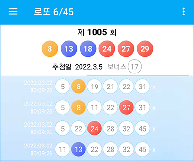 1006회 로또 당첨번호 예측은 행운이 필요하지만, 지난 로또1005회 당첨번호에서 4개 로또 1등 번호를 맞춘 로또6/45앱이 딱 마음에 듭니다.