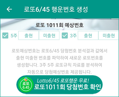 1011회 로또 예상 번호를 로또행운을 생성할 때 저는 5주 3주 모두 체크하고 받습니다.