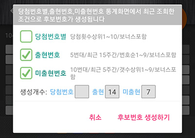 위에서 Lotto 후보 버튼은 후보번호 조합을 생성할 때 당첨번호별, 출현번호, 미출현번호 등으로 생성개수 비율을 조정할 수 있다는 사실.