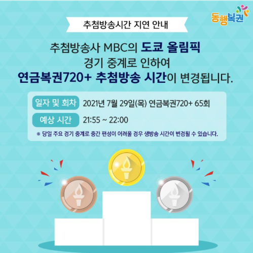 연금복권 720+ 65회 당첨번호 추첨시간 도쿄 올림픽 경기 중계 방송으로 65회 연금복권 추첨방송 시간 지연 안내