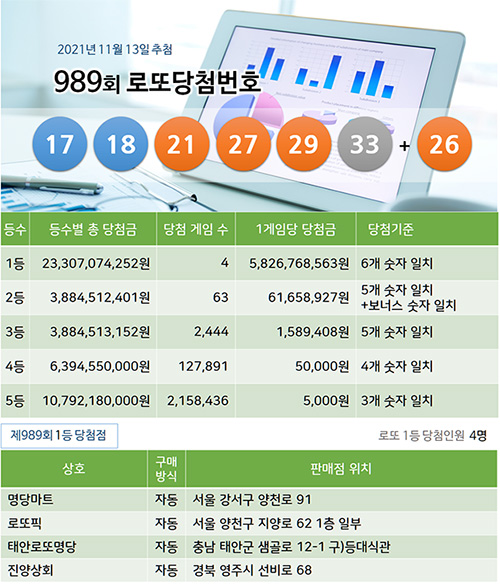 로또 989회 당첨번호 1등 58억원 당첨금 대박, 4명 모두 로또복권 자동 파악, 로또990회 당첨 예상번호 명중시킬 로또 1등 당첨 명당에서 990회 로또번호 받을 1등 2등 당첨지역 복권판매점 정보 입니다.