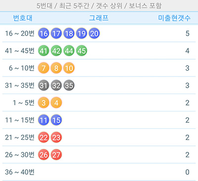 15주 동안 가장 많이 당첨된 번호대는 36번에서 40번대 구간입니다. 16회 당첨 되었네요. 31번에서 35번대는 15회 당첨 되었습니다.