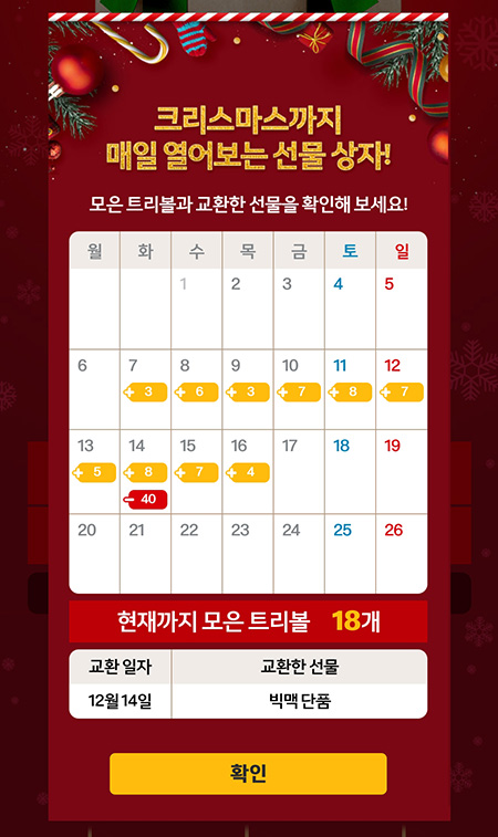 모은 트리볼은 26일까지 선물로 교환해야 한다고 합니다. 일단 선물 교환하면 쿠폰은 8일 이내에 사용하셔야 한답니다.