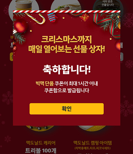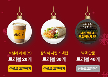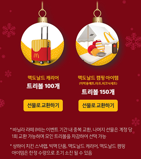 맥도날드 캐리어 트리볼 100개 선물로 교환하기 크리스마스 행복 충전 이벤트 캠핑 아이템 빅맥 상하이 치킨 스낵랩 바닐라 라떼 풍성한 쿠폰 교환