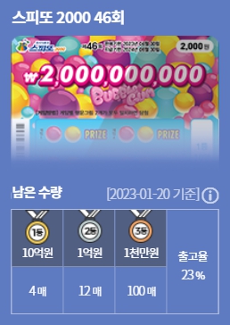 46회차 스피또 2000은 출고율이 23%이고, 1등 10억원 복권은 4매 남아 있습니다.