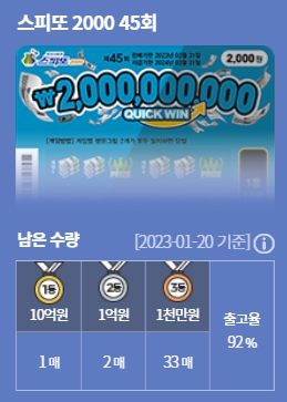 스피또 2000 45회차는 출고율 92%이고, 1등 10억원 1매 남아 있고, 2등 1억원은 2매 남아 있습니다.