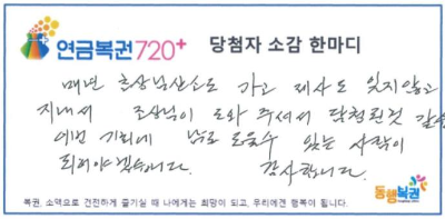 80회차 연금복권720+ 1등 1매, 2등 4매 동시 당첨된 후기 입니다. 첫 10년 동안 매월 1100만원씩, 이후 10년 동안 매월 700만원씩 당첨금을 받게 되어 생활안정 최고 입니다.