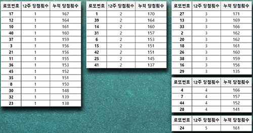 로또 당첨 번호 12주간 추첨된 내역을 누적 당첨횟수로 확인하여 6개 로또 행운번호 선별하는 분석도 마음에 드는 내용이였습니다.