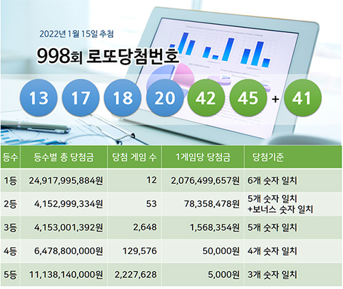 로또999회 당첨예상번호는 1월 22일 로또999회 당첨번호 추첨에서 당첨결과 확인 가능 합니다. 지금부터 로또예상번호 준비해 보시길 바랍니다.