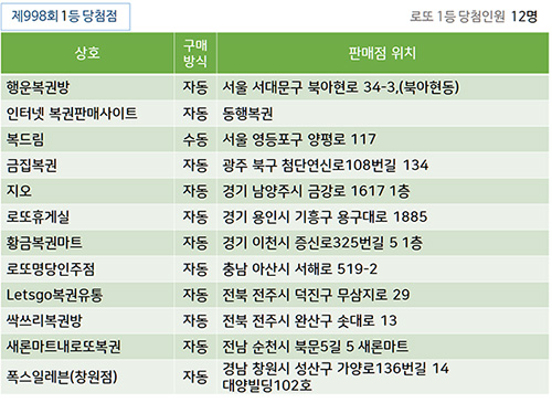복권판매점에서 998회 1등 자동으로 10명이 당첨 되었는데, 서울 행운복권방, 광주 금집복권, 경기도 지오, 로또휴게실, 황금복권마트 등이 일등을 배출 하였습니다.
